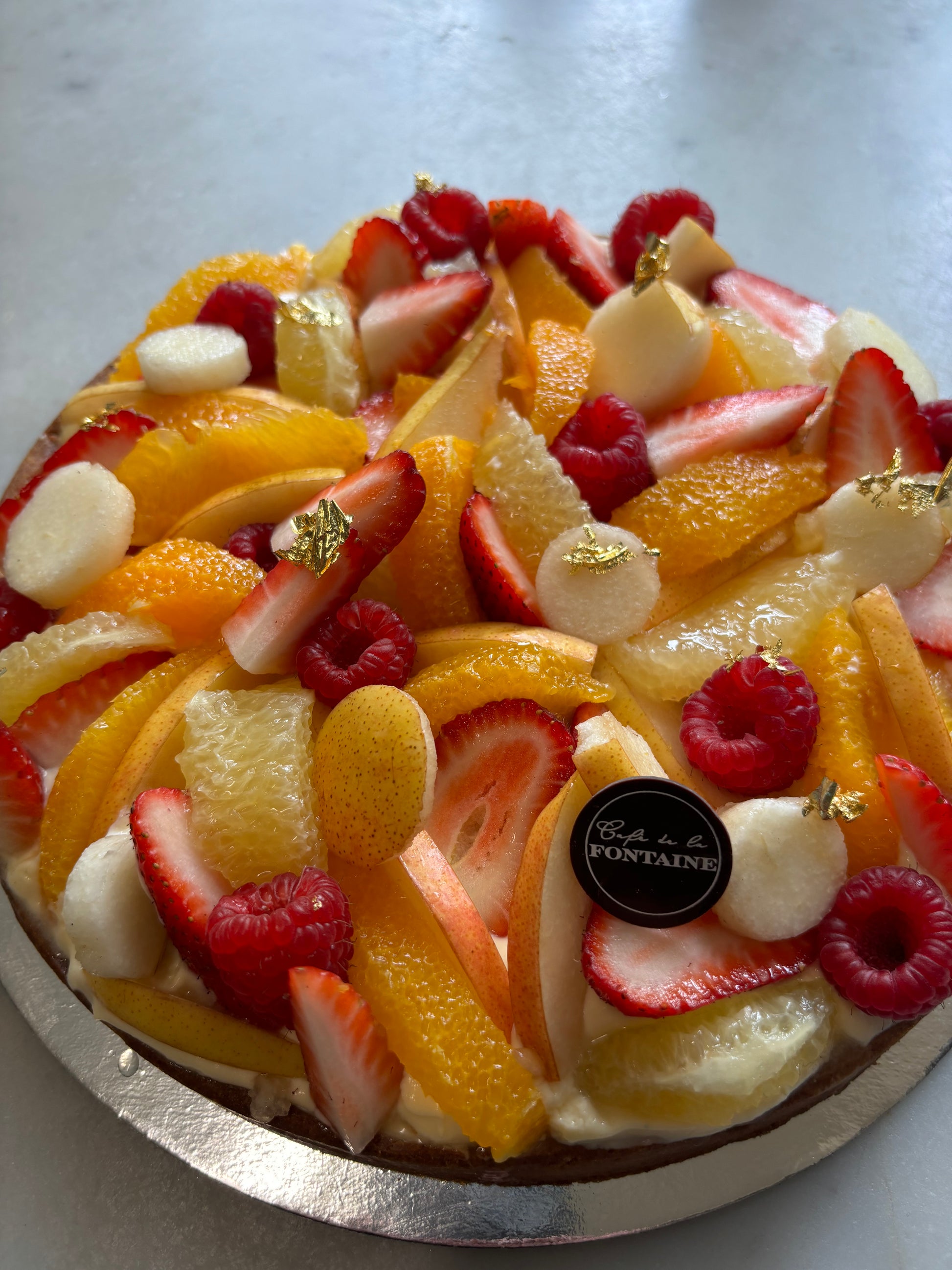 A delicious and seasonal mixed fruit tart with a delicate pastry cream and crisp tart base, finished with 24K gold leaf.